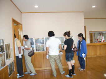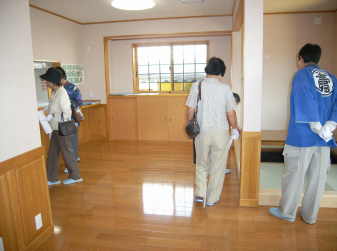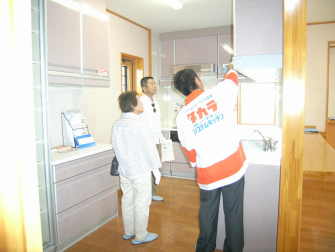 この建物ができる過程をパネルで説明しています。 システムキッチンの説明をしています。 畳コーナーに設置した堀コタツの説明を聞くお客様