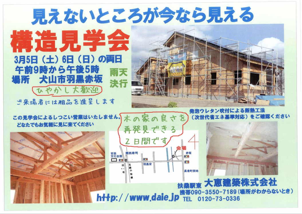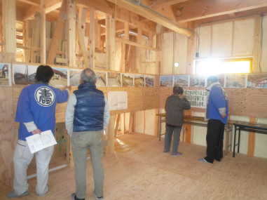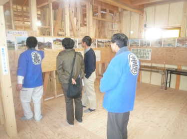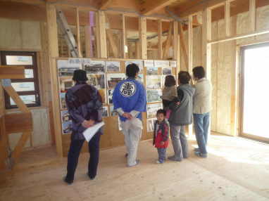 平成23年3月5日(土)6日(日)に開催しました構造造見学会 には大勢のお客様にご来場いただき有難うございました。 今回、約60組ものお客様にご来場いただき貴重なご意見を いただきました。今後も頂いたご意見をもとにま邁進してゆく 所存です。 パネル写真でこの現場の現在までの経過を説明しました。 今までの新築、リフォーム工事の施工例をパネルで説明しました。 アンケートにお答え有難うございました。