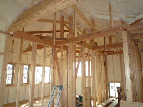 瑕疵保険の為の上部躯体検査を受け合格しました。外部に面する壁、屋根には発泡ウレタンを吹付します。