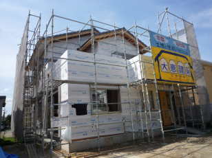 外壁には透湿防水シートが張られました。 外壁下地の模様です。
