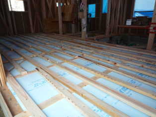 床断熱材スタイロフォーム65oの上に根太を組み針葉樹合板を捨て張りします
