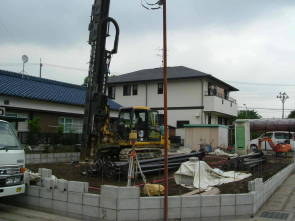 地盤調査の結果約4.8mの深さまで軟弱地盤と判明、鋼管くいを打ち込む地盤改良を施工しました。